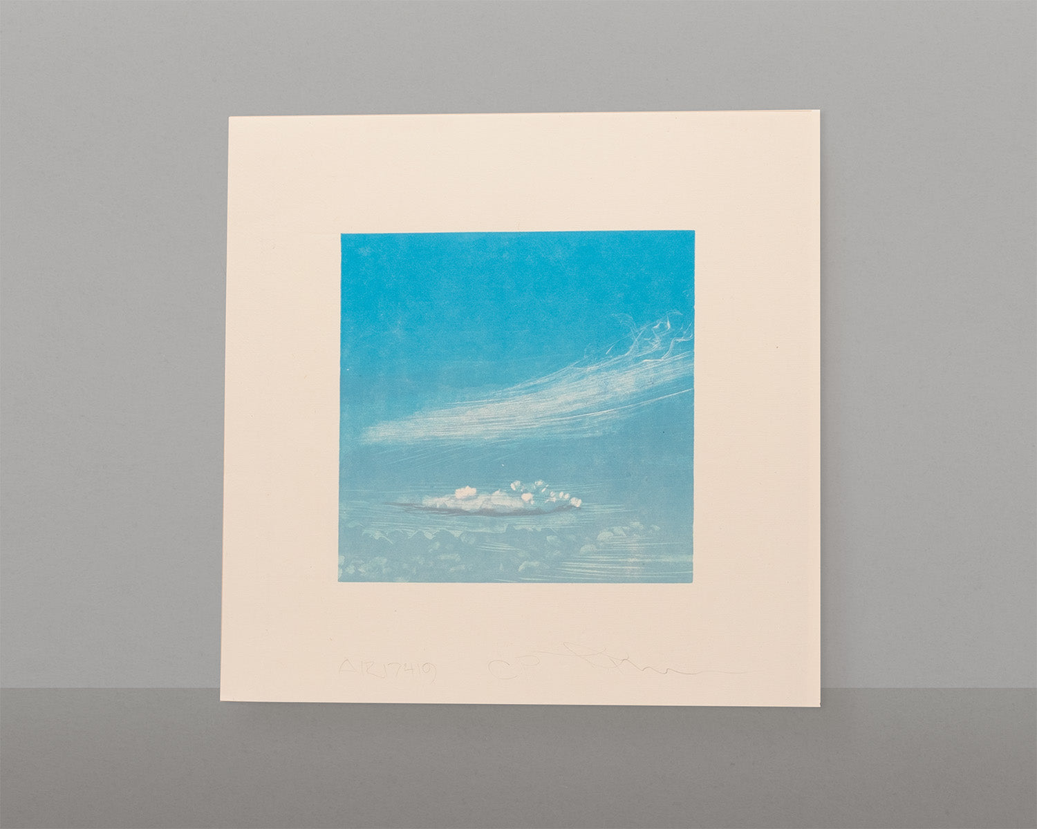 This contemplative relief print captures a moment of sky and wispy clouds.