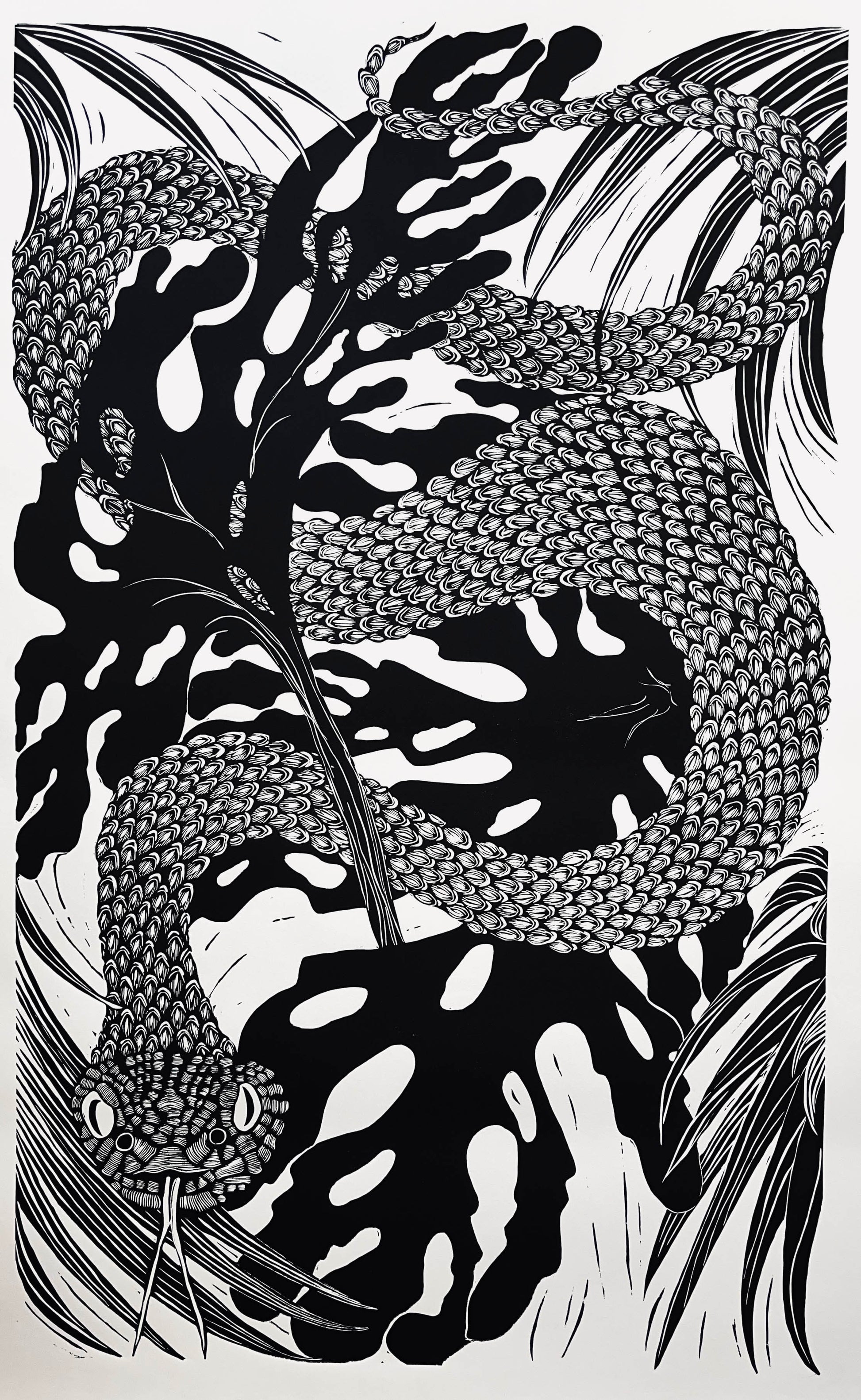 As part of her series of Animals of the Chinese Zodiac, Terri Thoman hand-carved and printed this large woodblock print celebrating the year of the snake.