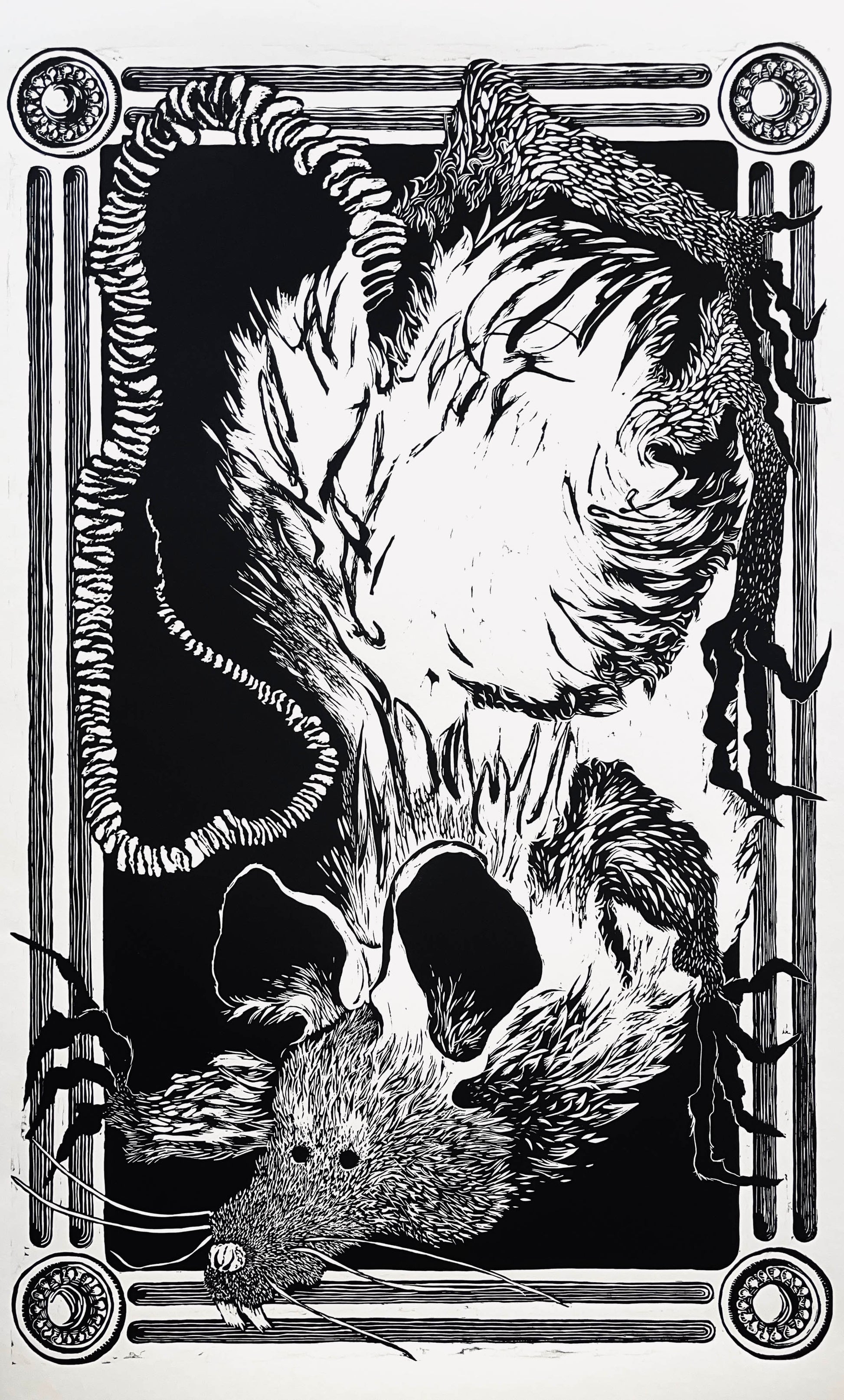As part of her series of Animals of the Chinese Zodiac, Terri Thoman hand-carved and printed this large woodblock print celebrating the year of the rat.