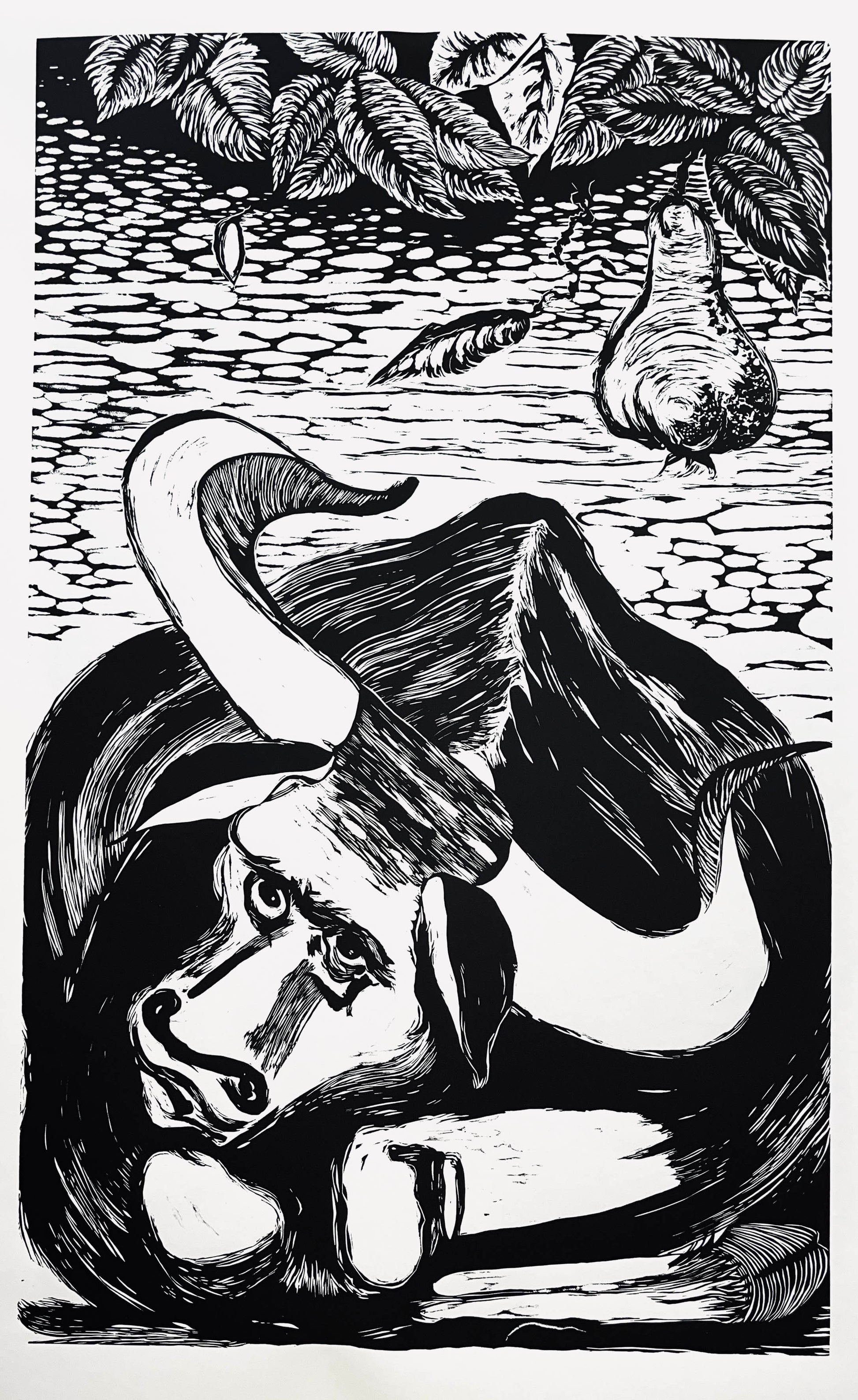 As part of her series of Animals of the Chinese Zodiac, Terri Thoman hand-carved and printed this large woodblock print celebrating the year of the ox.