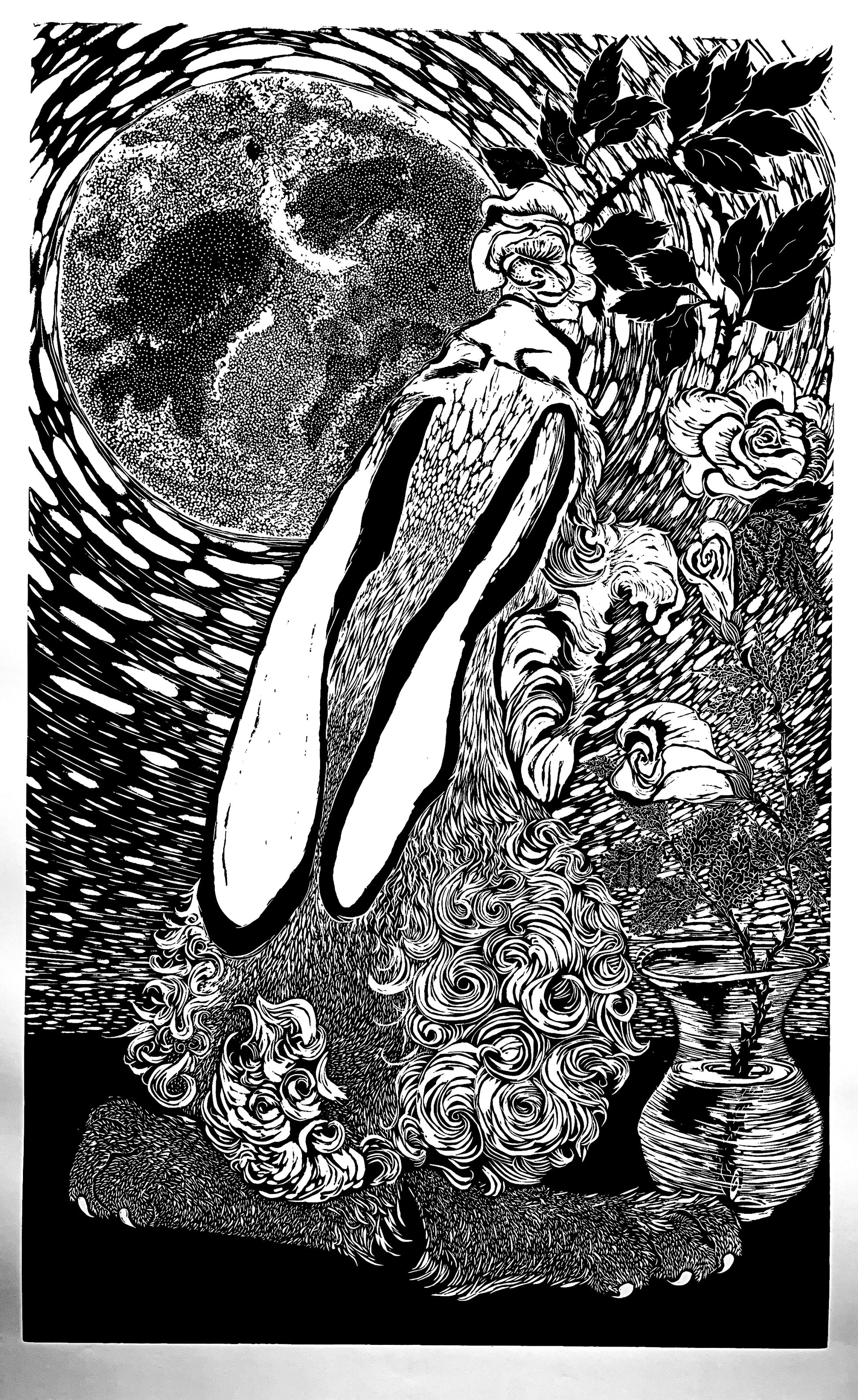 As part of her series of Animals of the Chinese Zodiac, Terri Thoman hand-carved and printed this large woodblock print celebrating the year of the rabbit.